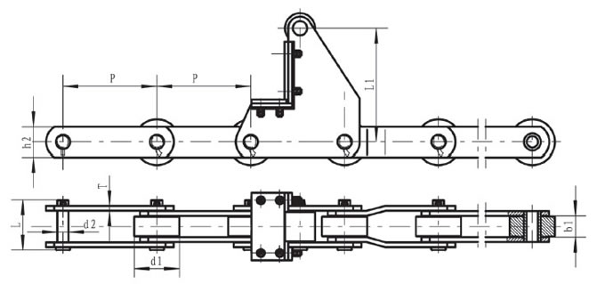 | Chain no. | Pitch P (mm) | Inner width of inner link b1 (mm) | Diameter of roller d1 (mm) | Diameter of pin d2 (mm) | Length of pin L (mm) | Height of sidebar h2 (mm) | Thickness of sidebar T (mm) | Width of attached plate L1 (mm) | Tensile strength Q (KN) |