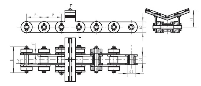 | Pitch P (mm) | Inner width of inner link b1 (mm) | Diameter of roller d1 (mm) | Diameter of pin d2 (mm) | Length of pin L (mm) | Height of sidebar h2 (mm) | Thickness of sidebar T (mm) | Height of top plate H2 (mm) | Tensile strength Q (KN) |