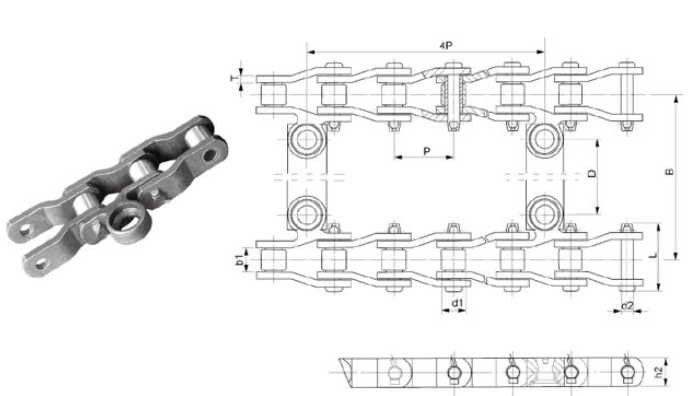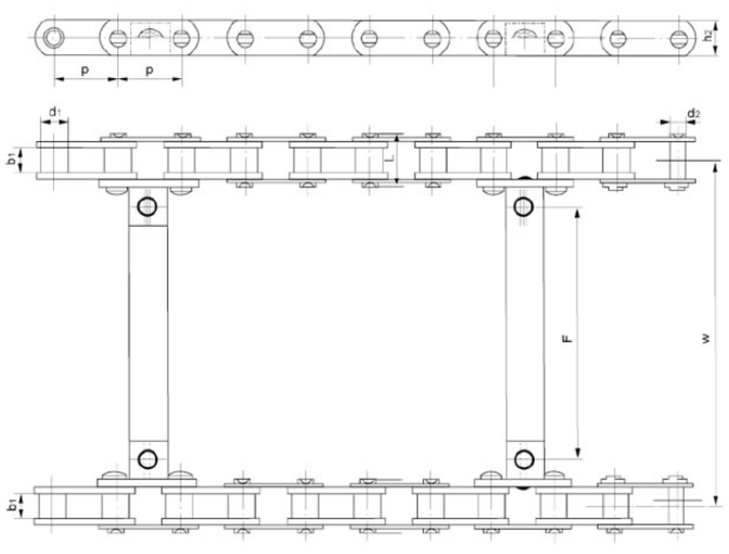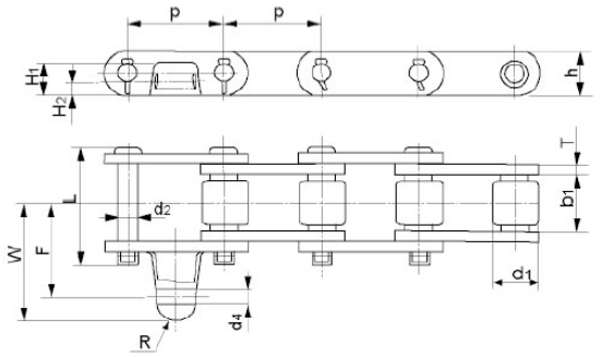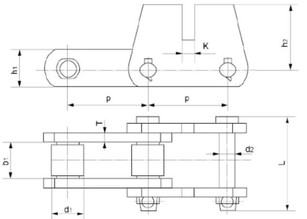 節(jié)距 P (mm) | 內(nèi)節(jié)內(nèi)寬 b1 (mm) | 滾子直徑 d1 (min.) (mm) | 銷軸直徑 d (mm) | 銷軸 長度 L (mm) | 鏈板高度 h1 (max) (mm) | 鏈板厚度 T (max) (mm) | 附件尺寸 | 抗拉強度Q (min) (KN) | |