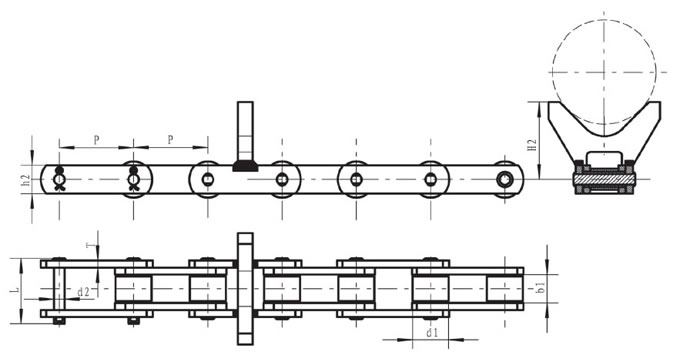 | Pitch P (mm) | Inner width of inner link b1 (mm) | Diameter of roller d1 (mm) | Diameter of pin d2 (mm) | Length of pin L (mm) | Height of sidebar h2 (mm) | Thickness of sidebar T (mm) | Height of attached plate H2 (mm) | Tensile strength Q (KN) |